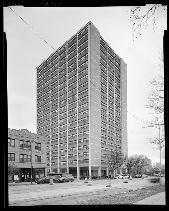 Island Terrace, on 6430 S. Stony Island Ave, built in 1969, is an important building in the history of affordable housing. The 21-story high-rise made up of 241 one-, two-, and three-bedroom apartments helped address Woodlawn’s affordable housing crisis in the 1960s. Island Terrace was the first affordable housing development to embody Chicago’s Modernist high-rise style pioneered by Mies Van der Rohe. Major architect John Moutoussamy (1922-1995), who studied under van der Rohe at Illinois Institute of Technology, oversaw the Island Terrace project as partner at the Dubin, Dubin, Black and Moutoussamy. Island Terrace is an example of a successful public works project. Moutoussamy’s firm funded their project with low-interest federal mortgage subsidies created by the federal Housing Act of 1968.