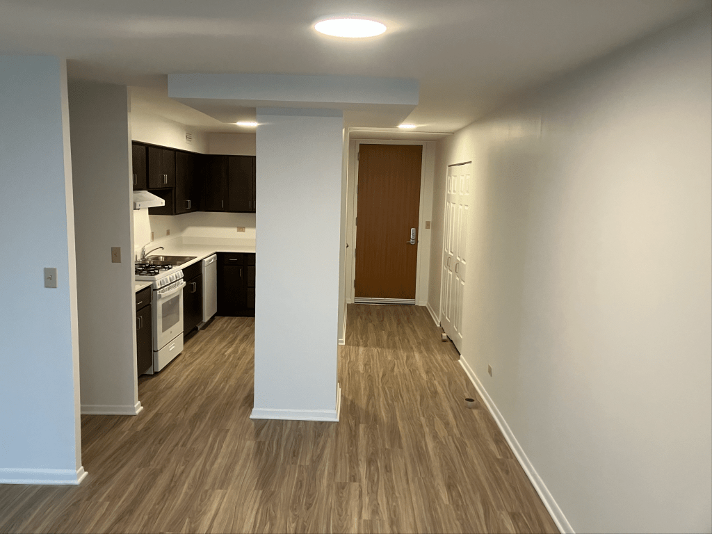 The kitchen and living room in a renovated unit.
